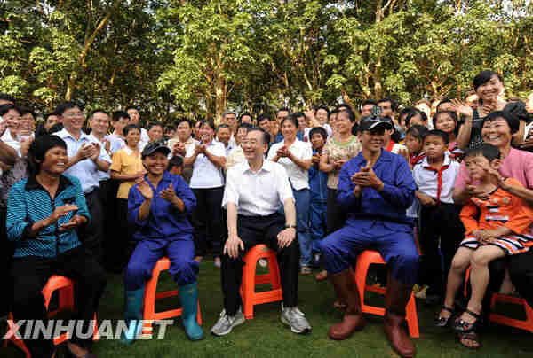 这是4月19日,温家宝在澄迈县红光农场考察时,在橡胶林旁向农场工人了解农场生产情况。4月18日至19日,中共中央政治局常委、国务院总理温家宝在海南省考察。 新华社记者黄敬文摄