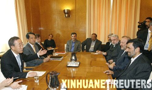4月20日,联合国秘书长潘基文(左一)与伊朗总统艾哈迈迪-内贾德(右一)在瑞士日内瓦举行会谈。 新华社/路透