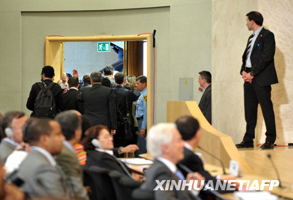 4月20日,在瑞士日内瓦,来自欧盟国家的代表在伊朗总统艾哈迈迪-内贾德发表讲话期间离开会场。新华社/法新
