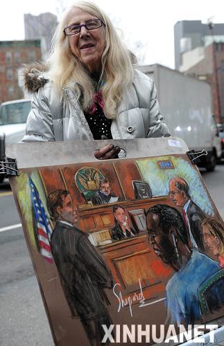 4月21日,在纽约一家联邦法院外,一位参加了庭审的艺术家在庭审结束后向记者展示她绘制的一幅描绘庭审现场的画作。当日,被美国海军俘获的索马里海盗阿卜迪瓦里在纽约一家联邦法院出庭受审。据信,阿卜迪瓦里是一个世纪以来首个在美国受审的海盗嫌疑人,如果定罪,他可能被判处终身监禁。新华社记者申宏摄