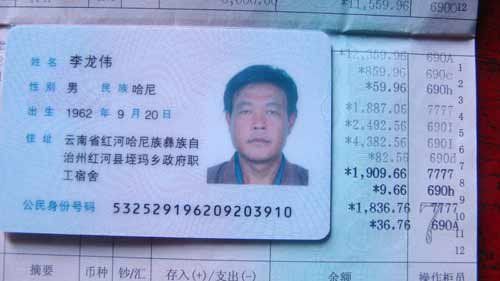 核心提示:云南红河县垤玛乡司法所所长李龙伟带病坚持工作,最后突发脑溢血猝死家中。这位司法所长留给妻儿的,只有工资卡上的36.76元。 李龙伟在工资卡上最后的余额是36.76元
