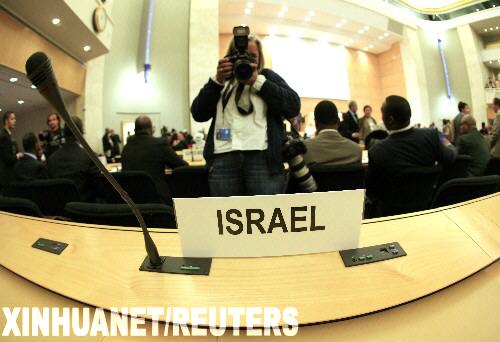 4月20日,在瑞士日内瓦,一名摄影记者面对以色列代表空空的席位拍照。伊朗总统艾哈迈迪-内贾德当天在联合国德班审议会议上发言时,先把以色列称作“最残暴的种族主义政权”,又将美国及一些欧洲国家描述为“罪犯帮凶”,致使来自20多个国家的代表离开会场。 新华社/路透