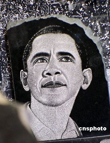 2009年2月17日,上海小店内出售的奥巴马肖像石雕。随着奥巴马当选美国新一届总统,也给商家带来巨大商机,许多与其相关的产品都以不菲的价格开始在国内热销。 中新社发 井韦 摄