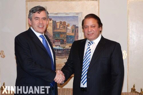 4月27日,巴基斯坦穆斯林联盟(谢里夫派)领导人谢里夫(右)在伊斯兰堡会见到访的英国首相布朗。布朗当天在对巴基斯坦进行访问时表示,巴基斯坦和英国都是恐怖主义的受害方,英国全力支持巴基斯坦的反恐努力,并将为此提供力所能及的帮助。新华社发