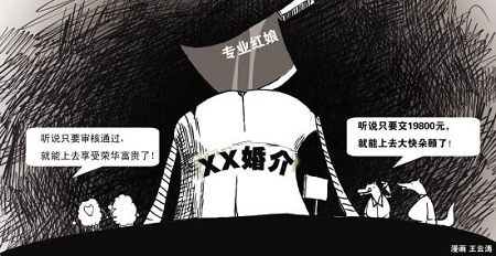 “收费19800元起,专业‘红娘’帮你牵线,一年八位美女任挑。”近日一个叫“世×佳×”的婚恋网站推出了“超高价”的“红娘”服务。不过,不少男士给“一年内如果跟八位美女都不‘来电’的话,这笔钱就等于打水漂”的规定给唬住了。不少欲当应选女的女生也对这种金钱选美不屑一顾。