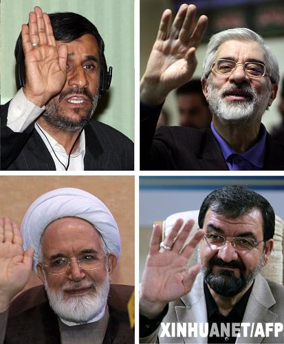 这张拼版照片显示的是报名参加伊朗新一届总统竞选的伊朗现任总统艾哈迈迪-内贾德(左上)、前总理穆萨维(右上)、前议长卡鲁比(左下)和前伊斯兰革命卫队总司令、确定国家利益委员会秘书雷扎伊(右下)。伊朗选举委员会负责人达内什朱5月10日宣布,截至9日,共有475人报名参加6月12日举行的伊朗第10届总统竞选,比2005年上届总统竞选的1014名报名者减少了约53%。新华社/法新