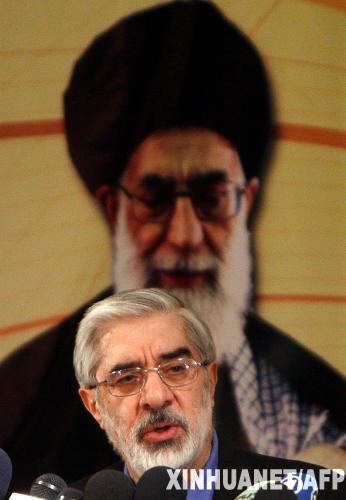 5月9日,伊朗前总理穆萨维在首都德黑兰内政部登记参加总统竞选后举行新闻发布会。当日,穆萨维在内政部正式登记参加将于6月12日举行的伊朗第10届总统竞选。新华社/法新