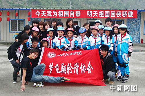 中新网武汉5月12日电 湖北经济学院轮滑协会13名成员自费赴四川汶川地区,给汶川县映秀小学、水磨小学的孩子们带去了24双轮滑鞋子和护具,并对他们进行培训,希望通过轮滑运动,见证跌倒之后爬起来的勇敢人生。