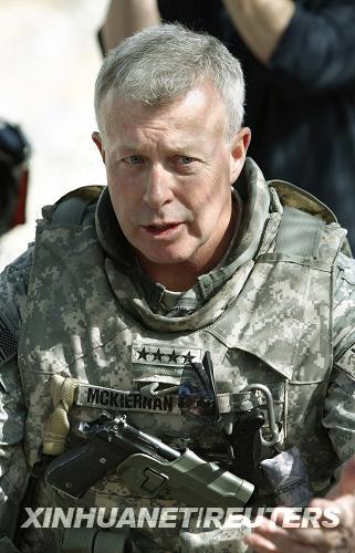 5月11日,美国国防部长盖茨在华盛顿五角大楼的新闻发布会上宣布,他已要求驻阿富汗美军指挥官麦基尔南上将辞职,并推荐前美军特种作战司令部司令麦克里斯特尔中将接任。这是5月8日,麦基尔南陪同盖茨访问阿富汗瓦尔达克省空军基地时的资料照片。