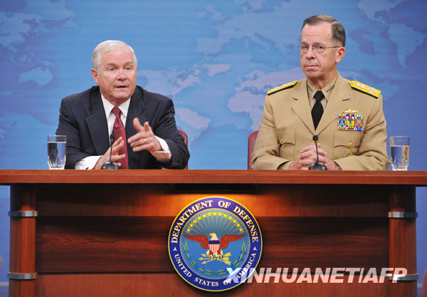 5月11日,美国国防部长盖茨(左)和美国参谋长联席会议主席迈克尔·马伦在首都华盛顿五角大楼出席新闻发布会。当日,盖茨在新闻发布会上宣布,他已要求驻阿富汗美军指挥官麦基尔南上将辞职,并推荐前美军特种作战司令部司令麦克里斯特尔中将接任。新华社/法新