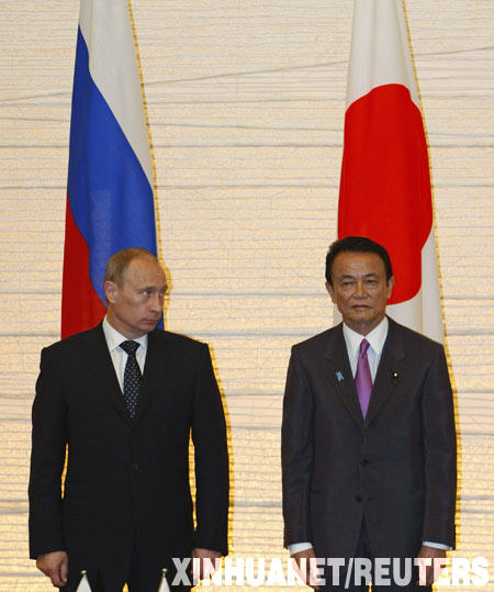 5月12日,在日本东京,俄罗斯总理普京(左)和日本首相麻生太郎出席签字仪式。正在日本访问的俄罗斯总理普京当日在东京举行的“日本俄罗斯经济论坛”上发表演讲时表示,希望日本参与俄罗斯的石油、天然气输送管道等能源项目建设。 新华社/路透
