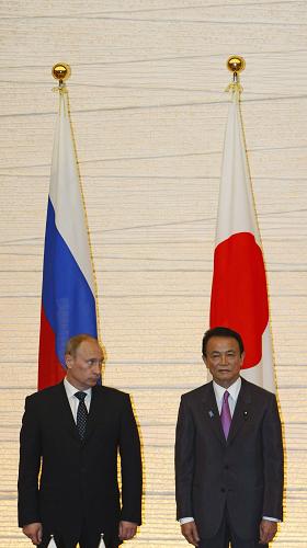 5月12日,在日本东京,俄罗斯总理普京(左)和日本首相麻生太郎出席签字仪式。正在日本访问的俄罗斯总理普京当日在东京举行的“日本俄罗斯经济论坛”上发表演讲时表示,希望日本参与俄罗斯的石油、天然气输送管道等能源项目建设。新华社/路透