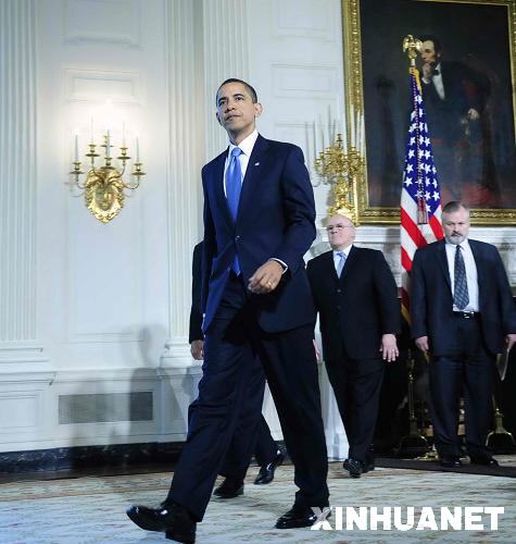 5月11日,美国总统奥巴马在首都华盛顿白宫发表讲话后离开。当日,奥巴马宣布了一项由美国医院、保险公司、制药商及医生联合提出的在未来10年削减2万亿美元医疗保健成本的计划,以帮助大约5千万目前没有医疗保险的美国人享受到医疗保险。 新华社记者张岩摄