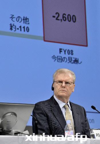 1月22日,索尼首席执行官斯特林格参加在日本首都东京举行的新闻发布会。 日本电器制造商索尼公司22日发表预测说,索尼公司本财年(截至2009年3月)将出现14年来首次营业亏损,亏损额达2600亿日元(约89日元合1美元),创该公司营业亏损的历史最高纪录。 新华社/法新