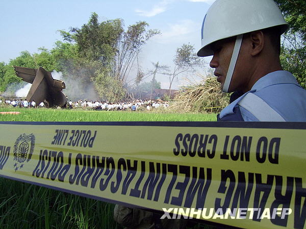 5月20日,在印度尼西亚东爪哇省的坠机事故现场,警方在失事飞机附近警戒。印度尼西亚军方一架大力神C130运输机当地时间20日早上6时25分(北京时间7时25分)在东爪哇省玛克丹坠毁。新华社/法新