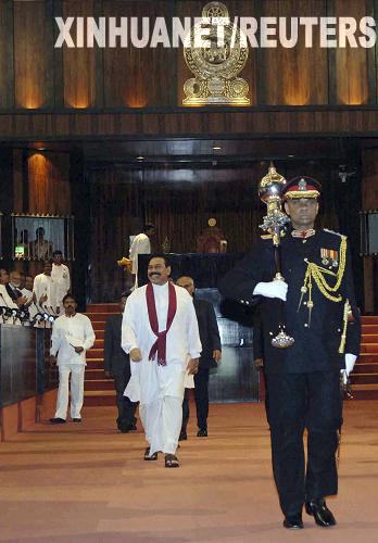 5月19日,在斯里兰卡首都科伦坡,斯总统拉贾帕克萨(中)抵达议会发表讲话。拉贾帕克萨说,斯政府军已在打击反政府武装泰米尔伊拉姆猛虎解放组织(猛虎组织)的军事行动中取得最后胜利,斯政府今后将寻求通过政治手段解决长期困扰斯里兰卡的民族问题。新华社/路透