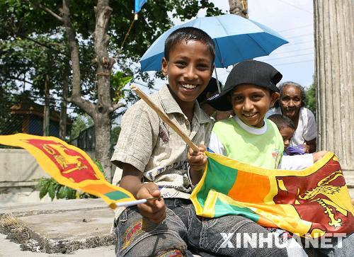 5月19日,在斯里兰卡首都科伦坡,两名少年手拿国旗参加庆祝仪式,庆祝历时26年的斯内战宣告结束。斯里兰卡总统拉贾帕克萨当日说,斯政府军已在打击反政府武装泰米尔伊拉姆猛虎解放组织(猛虎组织)的军事行动中取得最后胜利,斯政府今后将寻求通过政治手段解决长期困扰斯里兰卡的民族问题。新华社记者刘咏秋摄