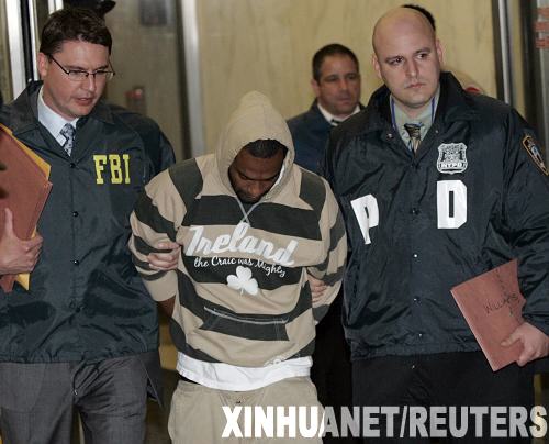 5月21日,在美国纽约,一名恐怖分子嫌犯(中)在被扣留后离开美国联邦调查局办公大楼。美国联邦调查局20日晚在纽约逮捕了4名恐怖分子嫌犯。据当地媒体报道,这4名出生在美国的恐怖分子嫌犯企图炸毁当地一家犹太教堂,并计划用导弹击落美军战机。他们还计划炸毁位于纽约市布朗克斯区的一个犹太人社区中心。新华社/路透