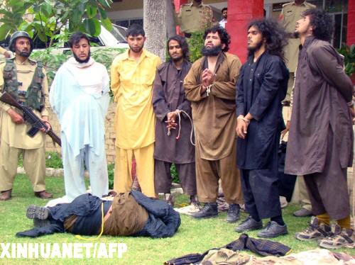 5月19日,巴基斯坦安全人员在莫哈曼德看守被捕的塔利班武装人员。巴基斯坦军方当天说,巴安全部队在过去24小时里,在西北部地区打死16名武装分子,另有4名安全部队成员在行动中死亡。 新华社/法新