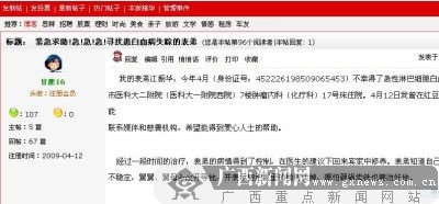 5月21日下午,南宁论坛的《紧急求助!寻找患白血病失踪的表弟》的帖子引起了记者的关注。网友“甘蔗16”发帖求援,说她那今年4月份患白血病住院的表弟江振华5月16日突然离家出走,没给家里留下只字片语。他的亲人们发动“地毯式”搜寻,并且在电视台上刊登了寻人启事,渺无音讯。情急之下,表姐“甘蔗16”发帖向网友求助,希望发动网友的力量,帮忙寻找失踪的表弟。