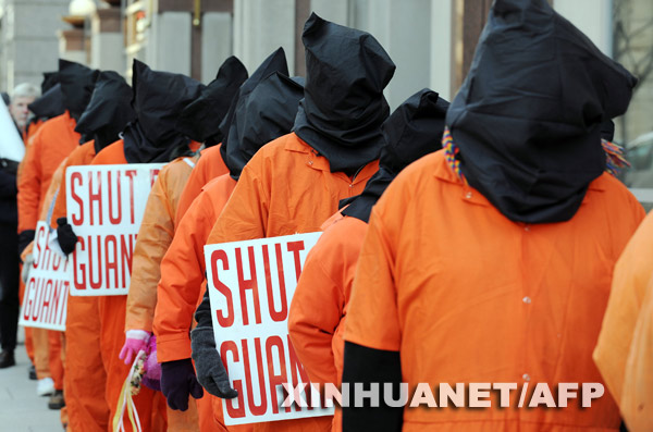 资料图片:1月14日,在美国首都华盛顿,抗议者装扮成美国设在古巴的关塔那摩监狱中囚犯的样子,呼吁美国政府关闭关塔那摩监狱。新华社/法新