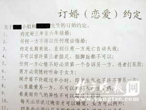 “约定好3年至6年结婚”、“吃饭前必须默念对方的名字一次”、“任何一方心情不好必须第一个告诉另一方,违者打屁股”、“每天思念对方的时间不可少于3小时,不可多于24小时”……扬州大学大一男生陈翰和在安徽求学的女友廖倩,近日签订了一份《恋爱约定》。端午小长假,陈翰将带着这份“合约”回家,请家长签名。该约定内容共有35条,涉及了生活中的点点滴滴。社会学和法律专家认为,这份条约不具备任何法律效应,尽管两个年轻人对待感情的态度有值得赞赏之处。