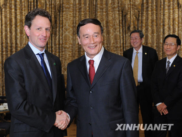 资料图片:4月2日,中国国务院副总理王岐山陪同国家主席胡锦涛出席二十国集团领导人第二次金融峰会期间在伦敦会见美国财政部长盖特纳。 新华社记者李学仁摄