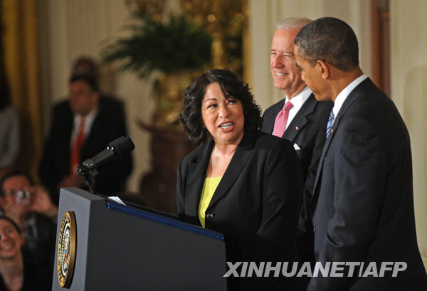 5月26日,在美国白宫,拉丁裔联邦女法官索尼娅·索托马约尔在演讲末尾向美国总统奥巴马(右)致谢。奥巴马当日提名索托马约尔担任最高法院法官,接替宣布将在6月退休的法官戴维·苏特。如果这一提名获得参议院批准,索托马约尔将成为美国历史上首名拉丁裔最高法院法官。新华社/法新