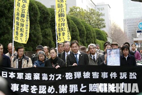 资料图片:2007年3月13日,侵华日军遗留化学武器受害者家属及支持者在日本东京高等法院门口举行抗议活动,要求日本政府承认侵华日军遗留化学武器给中国人民造成的伤害,并对此进行谢罪和赔偿。当日,日本东京高等法院就侵华日军遗留化学武器诉讼案作出二审判决,驳回了中国原告要求日本政府给予赔偿的诉讼请求。原告律师团表示将向日本最高法院提出上诉。 新华社记者任正来摄