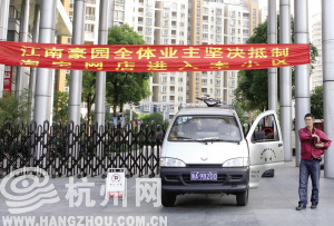 5月18日,滨江区江南大道边的江南豪园小区北门和南门口,都挂上这样的红色横幅。