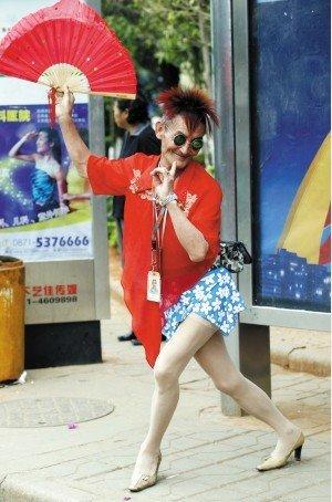 看到有人拍照,他急忙打开手中的扇子,不停变换着表情和pose,镜头感十足。因为太过专注,“美女”差点从公交站台上摔了下来。因此,他在开心当“模特”的同时,也不忘提醒被自己完全吸引住的市民:“看得(着)迭(点)嘎,小心车子!”