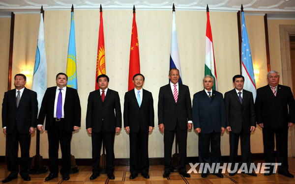 5月15日,在俄罗斯首都莫斯科,中国外交部长杨洁篪(左四)与上海合作组织其他成员国的外长及上合组织官员合影。当天,上合组织成员国外长会议在莫斯科举行。新华社记者张亚晨摄