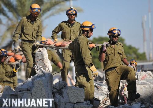 6月2日,在以色列南部的加特镇,参加仿导弹袭击演习的以色列士兵在一处房屋废墟里转移“伤员”。这次演习是以色列为期5天的全国范围应急演习的一部分。此次应急演习代号为“转折点3”,是迄今为止以色列举行的最大规模演习。 新华社记者殷博古摄