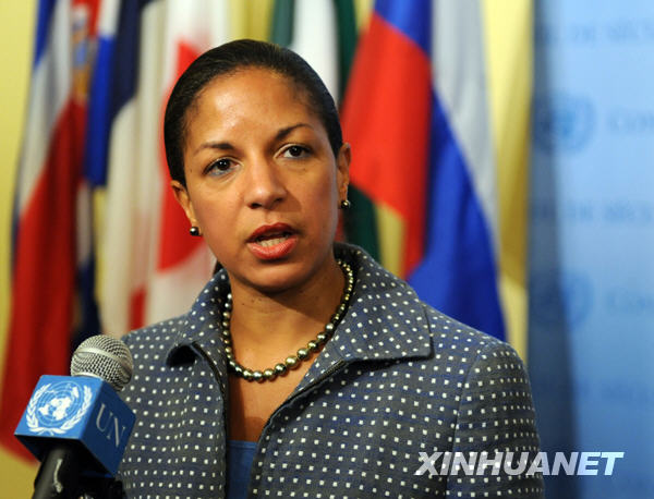 6月10日,在美国纽约联合国总部,美国常驻联合国代表苏珊·赖斯对媒体发表讲话。当日,联合国一位不愿透露姓名的外交官称,联合国五个常任理事国以及日本、韩国的代表就安理会关于朝鲜核试验问题的决议草案达成一致。随后,安理会15个理事国的代表举行闭门磋商,讨论7个国家达成一致的决议草案。新华社记者申宏摄