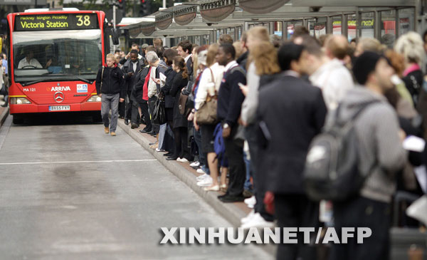6月10日,大批伦敦市民在一处公交车站等待上车。