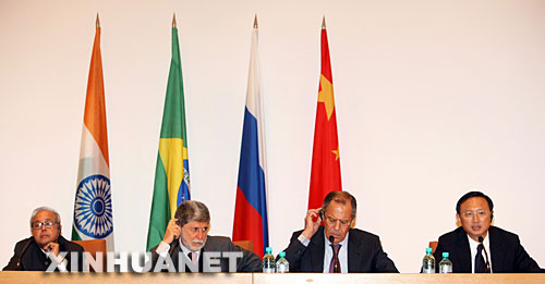 2008年5月16日,在俄罗斯叶卡捷琳堡市,印度外长慕克吉、巴西外长塞尔索·阿莫林、俄罗斯外长拉夫罗夫和中国外长杨洁篪(从左至右)在会谈后参加新闻发布会。这次会谈是四国外长在联合国框架之外的首次会晤。当日,中国外长杨洁篪表示,中国对解决当前世界粮食安全问题做出了巨大贡献,四国作为重要经济体,应共同努力,维护世界经济的均衡、协调与可持续发展。 新华社记者沈伯韩摄