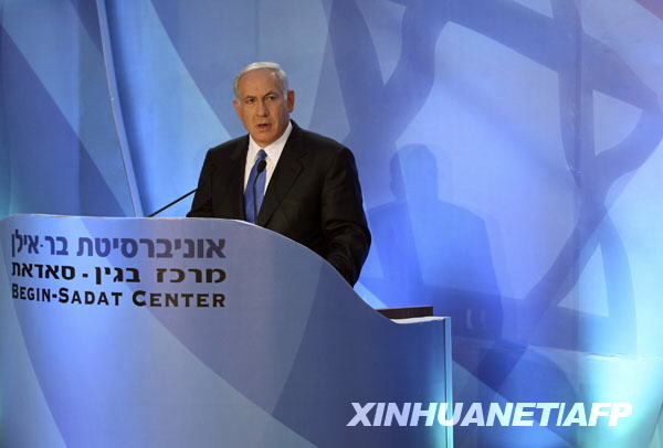 6月14日,在以色列巴尔伊兰大学,以色列总理内塔尼亚胡发表外交政策演说。当日,内塔尼亚胡表示,以方希望与巴勒斯坦方面立即重启和平谈判,也愿意接受一个非军事化的巴勒斯坦国。新华社/法新
