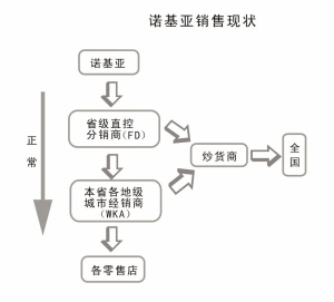 与此同时,诺基亚还实行一项政策:即某一型号的机子,给全国各省直控分销商的价格是一样的。于是,问题来了。比如一款机型,诺基亚给所有直控分销商的价格是3000元,各省直控分销商给WKA的价格统一是3300元,市场零售价则不会低于3500元。但在不同区域,比如贵州和浙江,一部3500元的手机销量会相差很多。贵州的FD为了完成月度任务拿到返利,便会想方设法把货销出去,于是2800元就把货散给了自己的WKA。WKA加点价又把货给了浙江或其他地区的炒货商(价格一定要比3000元低,否则和炒货商当地的FD相比就没有优势了)。
