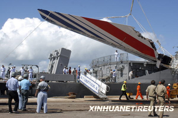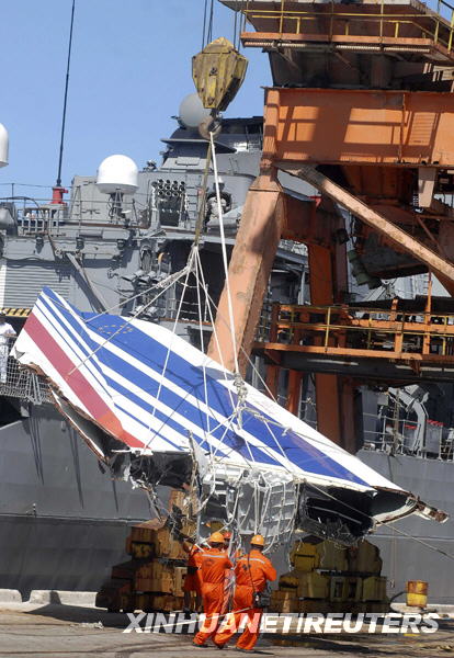 6月14日,被打捞上来的法航失事客机残骸运抵巴西东北部城市累西腓。巴西军方在14日晚间于累西腓举行的新闻发布会上宣布,随着法国军舰上的遗体被转交到巴西军舰上,打捞上来的法航失事客机遇难者遗体已增加到49具。 新华社/路透