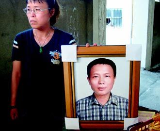 台商邵正吉在大陆遭员工杀害,图为妻子江美惠扶着丈夫的遗像