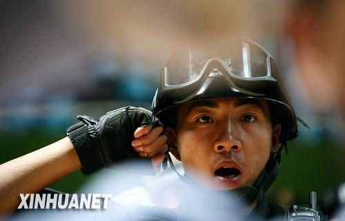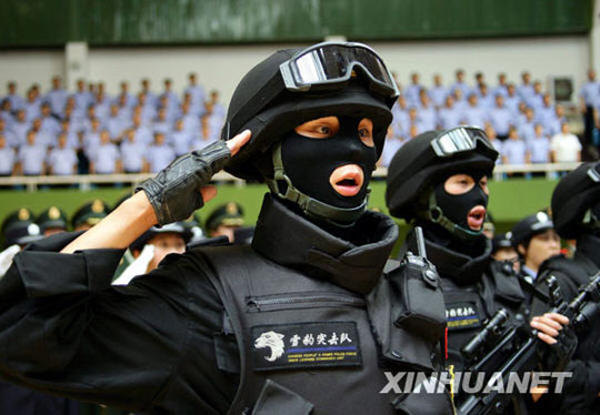 6月23日,北京市公安局举行安全保卫动员誓师大会,刑侦、治安、巡特警等系统民警代表及武警北京总队代表参加。此次誓师动员大会的召开标志着北京市国庆60周年安保工作全面启动。图为雪豹突击队队员在安全保卫动员誓师大会上宣誓。