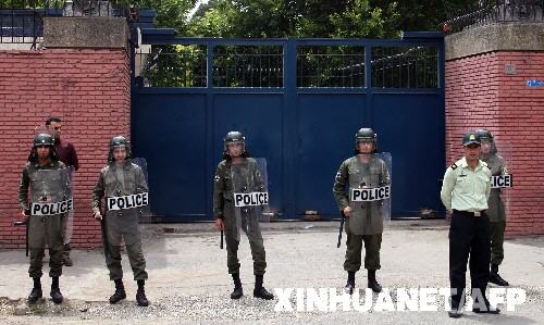 6月28日,伊朗法尔斯通讯社报道说,伊朗安全部门已经逮捕了8名与伊朗总统选举后骚乱有关的英国驻伊朗大使馆当地雇员。这是伊朗防暴警察在德黑兰的英国驻伊朗大使馆门外警戒的资料照片(2009年6月15日摄)。 新华社/法新