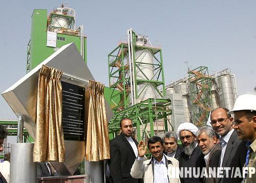 6月25日,在伊朗首都德黑兰以南约1200公里的迈赫尔石化设备厂,伊总统艾哈迈迪-内贾德(左二)出席落成典礼。艾哈迈迪-内贾德当日发表讲话,敦促美国总统奥巴马停止干涉伊朗的内部事务。 新华社/法新