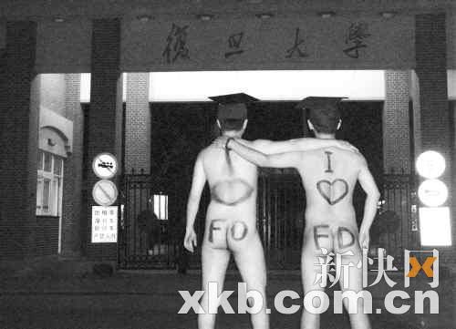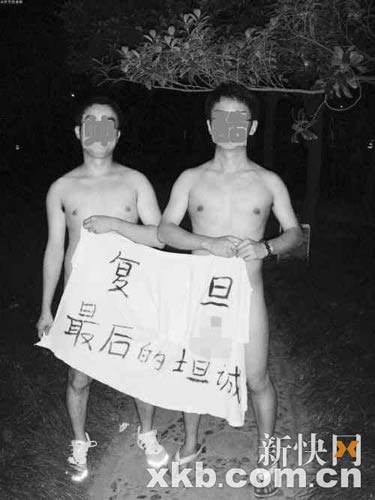 昨日,一条名为《复旦学生裸奔庆祝毕业》的图文帖,火遍论坛。在贴出的图片中,两名男生头戴学士帽,裸体在复旦校园内奔走,并在学校大门、校训等多个地方留影。在网帖中,发帖者并未对两名男生作介绍,但从其中一名男生在复旦的“恒隆物理楼”留影来看,网友们认为这两名男生应该是复旦物理系的毕业生。