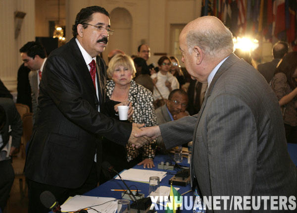 7月1日,在美国华盛顿举行的美洲国家组织特别会议上,被罢免的洪都拉斯总统塞拉亚(前左)和美洲国家组织秘书长因苏尔萨握手。因苏尔萨当日在华盛顿说,给予洪都拉斯军事政变领导人三天时间将政权交还给被罢免的总统塞拉亚。新华社/路透
