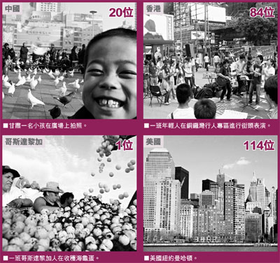 新华网消息 据香港文汇报报道,英国“新经济基金”组织公布的2009年度《幸福星球报告》显示,哥斯达黎加荣膺世界最幸福、最环保的国家,拉丁美洲国家高踞前十名其中9席。中国内地排第20位,相反香港则位列于第84位,美国114位,幸福指数比伊拉克及伊朗更低。