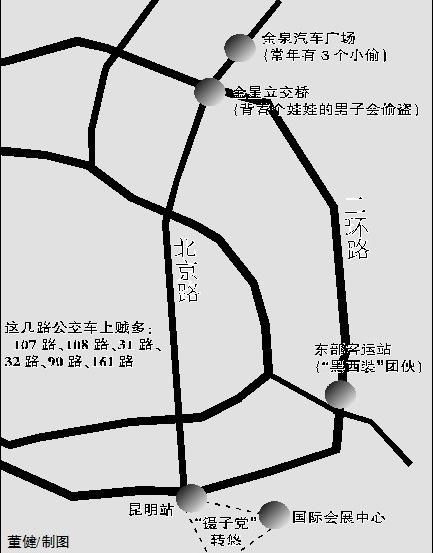 "真有那么夸张,亲眼所见。”对于活动在东部客运站的“黑西装”团伙,帖主强调“亲眼所见”的同时,还用了“夸张”一词描述。帖主说,你提包上车时“黑西装”一哄而上,伺机下手。而在金星立交桥附近,则有个三年如一日背着个不会长大的娃娃的男人,很好认,(大家要)见他就闪!还有,国际会展中心那里,至少两个人……遇到在昆明站转悠的“镊子党”,不要把钱放在外衣口袋里。跟帖:“完善”分布图