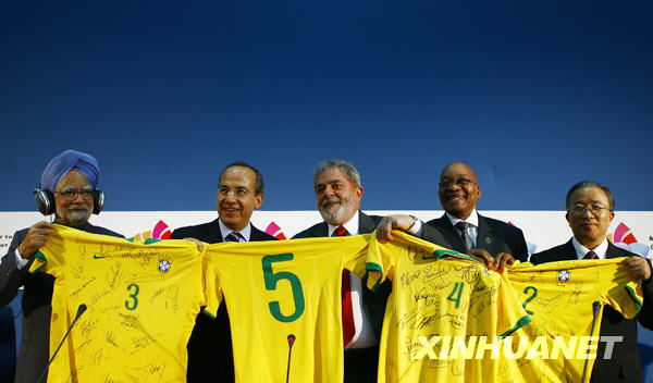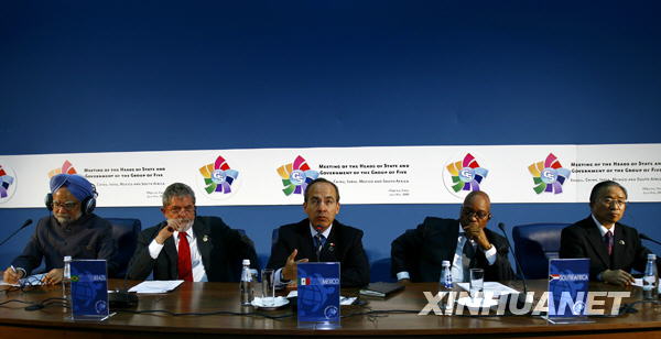 印度总理辛格说,全球性问题只有通过全球性方案才能解决。发展中国家受金融和经济危机影响最严重,必须通过全球协调努力才能巩固目前全球经济出现的复苏“嫩芽”,才能使得所采取的措施产生成果。 在谈到气候变化问题时,卡尔德龙说,必须进一步推动气候变化谈判,发展中五国要坚持“共同但有区别”的原则,最不发达国家才是受气候变化影响最严重的地方。他建议成立“绿色基金”,利用现有资源帮助发展中国家应对气候变化。