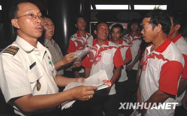 当天,被印尼方面扣押的59名中国渔民从雅加达乘飞机启程回国。6月20日,广西8艘渔船在中国南沙海域传统渔场内正常作业时被印尼渔业执法船抓扣。中国和印尼双方经过协商达成协议,印尼同意先释放75名被扣留中国船员中的59人。新华社记者岳月伟摄
