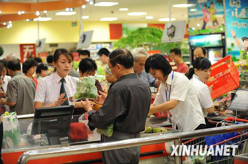 7月8日,在乌鲁木齐市王府井百货超市,市民正在收款台结账。新华社记者沙达提 摄